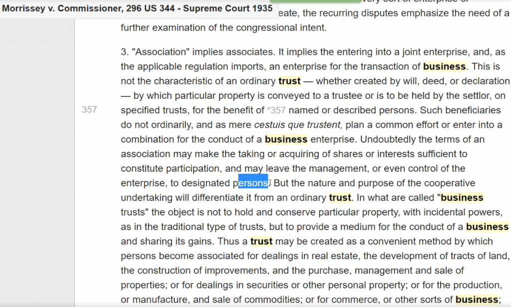 The term embraces associations as they may exist at common law. Hecht v. Malley, supra. We have already referred to the definitions, quoted in that case, showing the ordinary meaning of the term as applicable to a body of persons united without a charter “but upon the methods and forms used by incorporated bodies for the prosecution of some common enterprise.” These definitions, while helpful, are not to be pressed so far as to make mere formal procedure a controlling test. The provision itself negatives such a construction. Thus, unincorporated joint-stock companies have generally been regarded as bearing the closest resemblance to corporations. But, in the Revenue Acts, associations are mentioned separately, and are not to be treated as limited to “joint-stock companies,” although belonging to the same group. While the use of corporate forms may furnish persuasive evidence of the existence of an association, the absence of particular forms, or of the usual terminology of corporations, cannot be regarded as decisive. Thus, an association may not have “directors” or “officers,” but the “trustees” may function “in much the same manner as the directors in a corporation” for the purpose of carrying on the enterprise. The regulatory provisions of the trust instrument may take the place of “bylaws.” And, as there may be, under the reasoning in the Hecht case, an absence of control by beneficiaries such as is commonly exercised by stockholders in a business corporation, it cannot be considered to be essential to the existence of an association that those beneficially interested should hold meetings or elect their representatives. Again, while the faculty of transferring the interests of members without affecting the continuity of the enterprise may be deemed to be characteristic, the test of an association is not to be found in the mere formal evidence of interests or in a particular method of transfer.