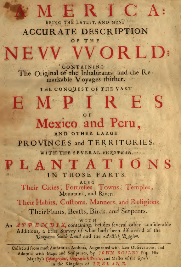 America: Being the latest and most accurate description of the new world – containing the Original of the Inhabitants, and the Remarkable Voyage thither. The Conquest of the vast empires of Mexico and Peru, and other Large Provinces and Territories